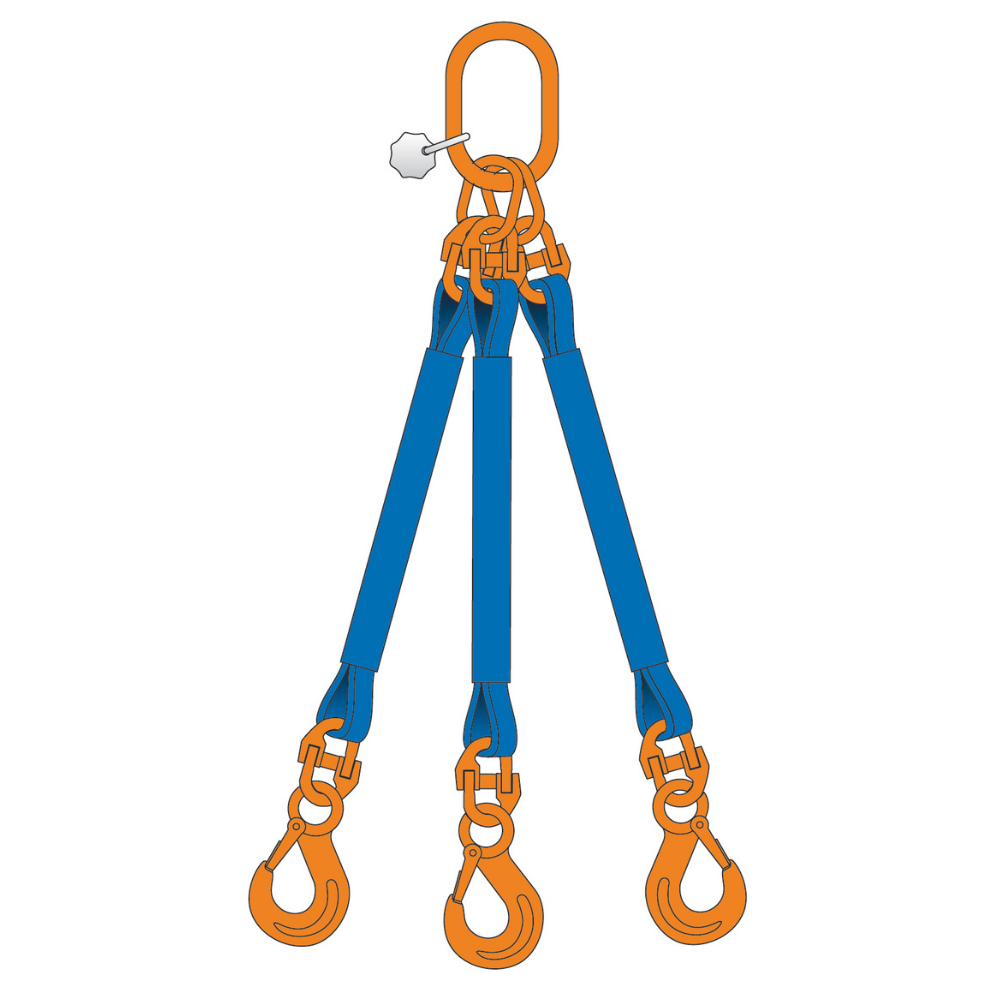Eslingas de poliéster de 3 ramales con accesorios de cadena REMA G10, las cuales pueden estar compuestas de eslingas planas y redondas, conectores de cadena planos WCL o estándar RCX y con diferentes ganchos de ojo como el REH o RES.